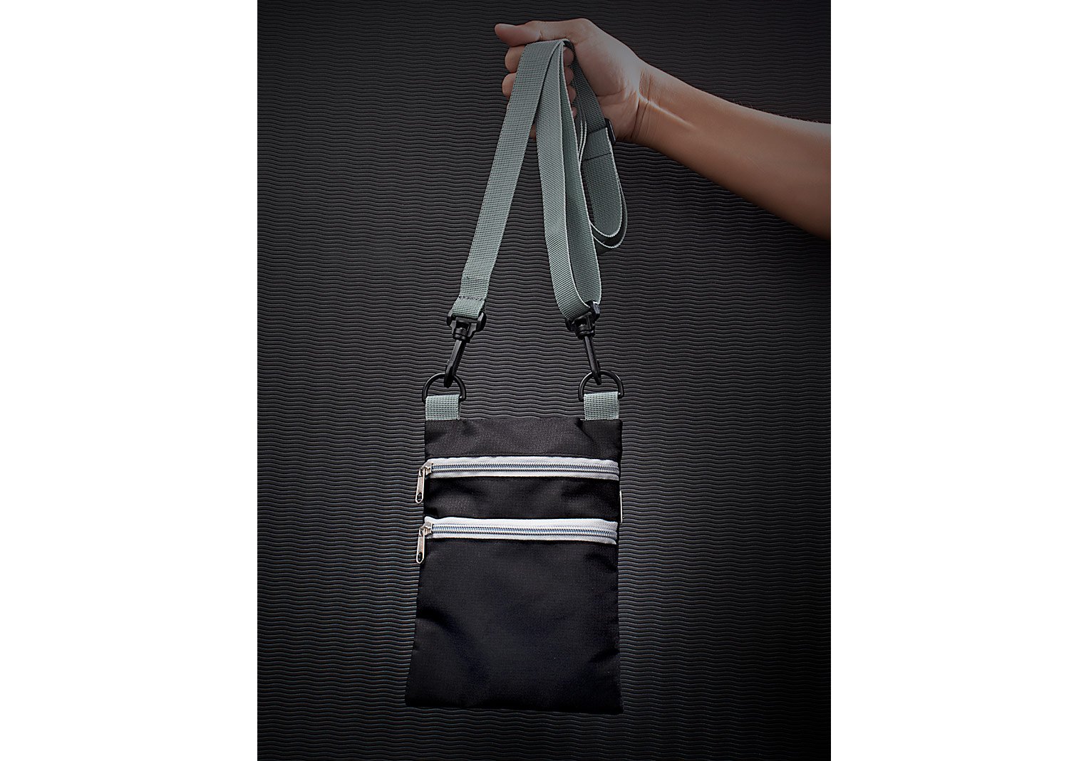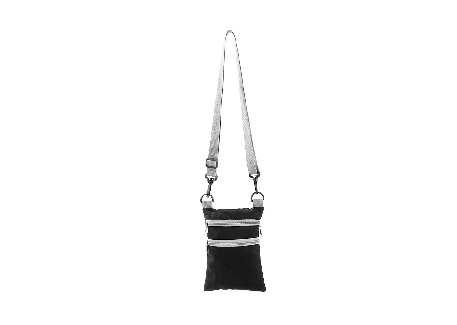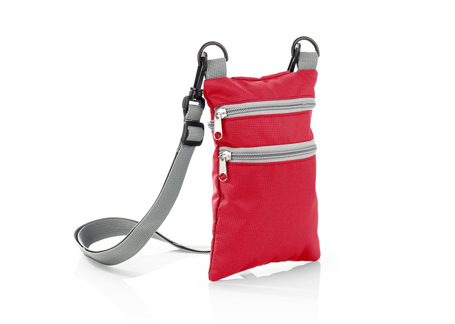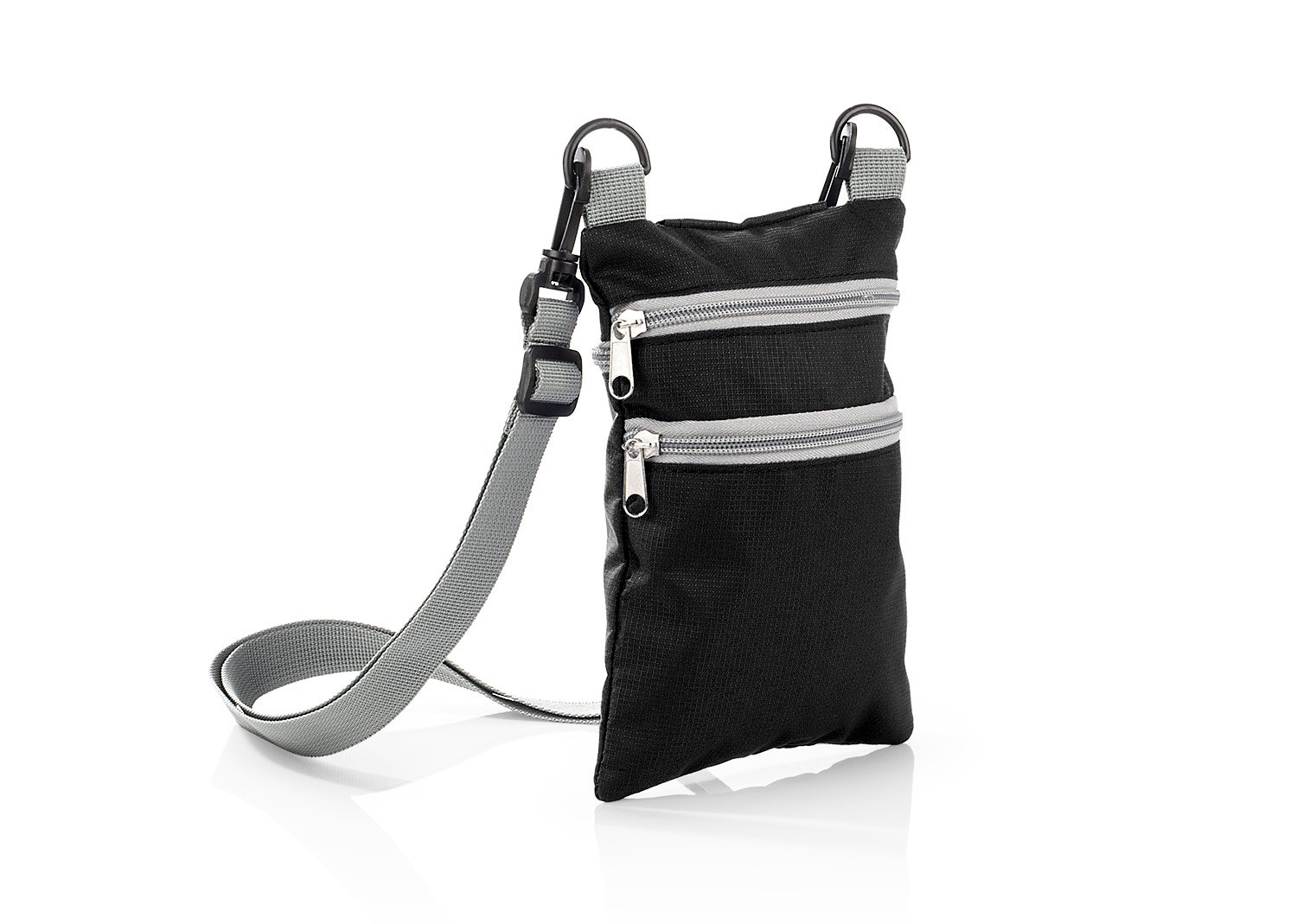Portapasaportes con 2 bolsillos frontales y 1 bolsillo trasero con cremallera y cargadera ajustable.