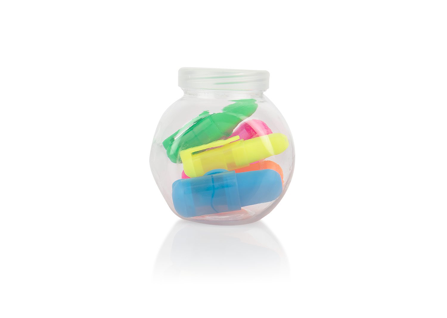 Accesorios de EscritorioJuego de 5 resaltadores en estuche traslucido plástico. Colores rosado, naranja, azul, verde y amarillo.