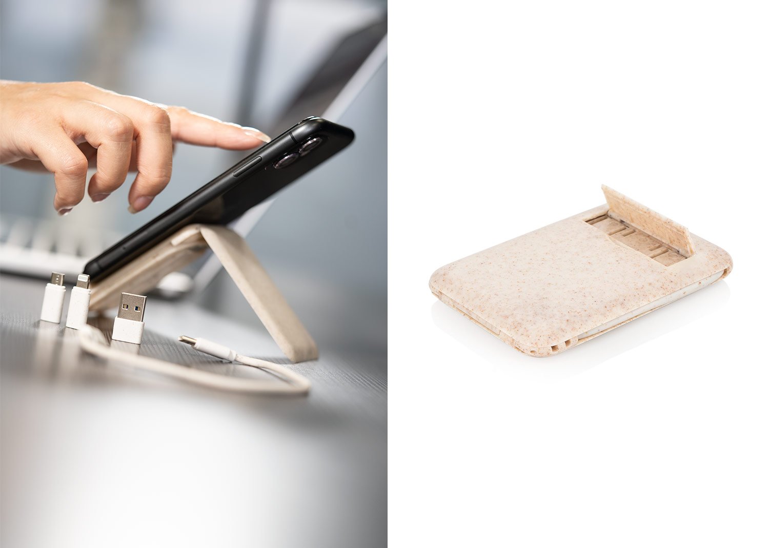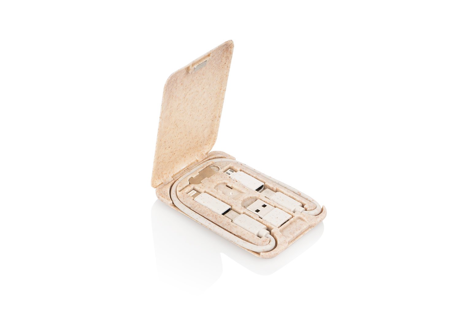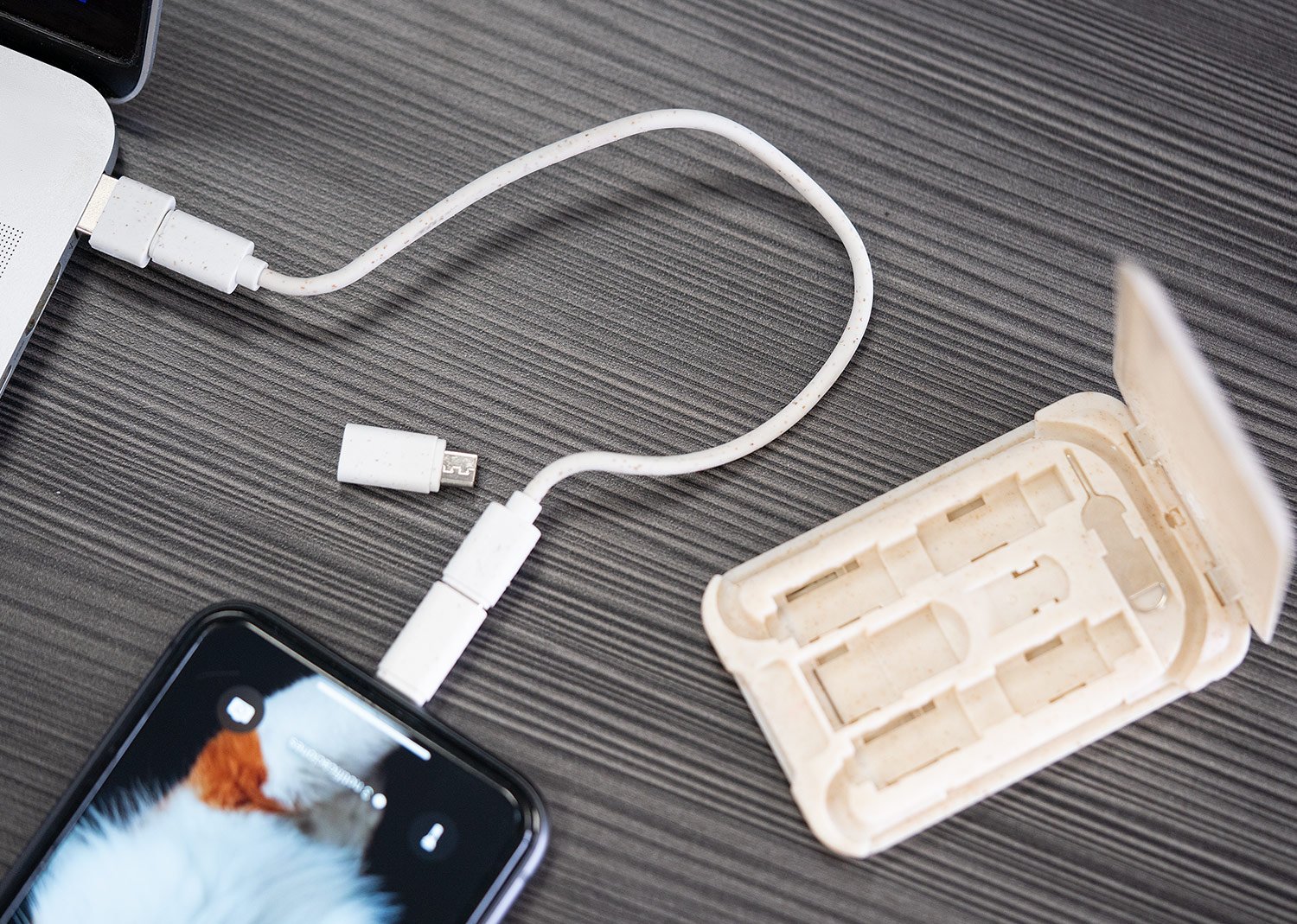 Juego de cables de carga con puertos USB, Tipo-C y Lightning, 5V DC 3.1, que incluye un adaptador para expulsar la tarjeta SIM del celular. El estuche puede usarse como soporte para el teléfono móvil.