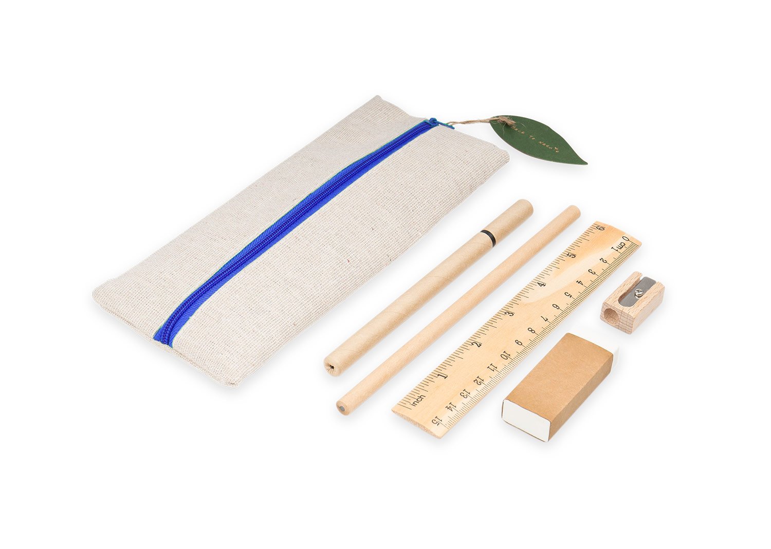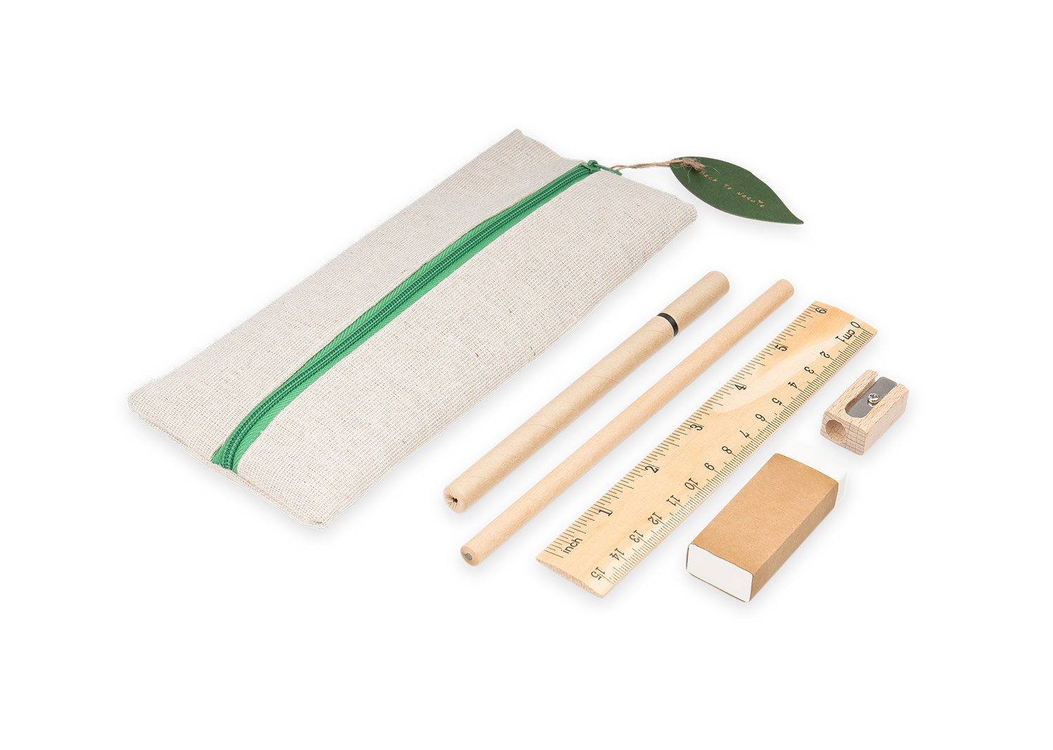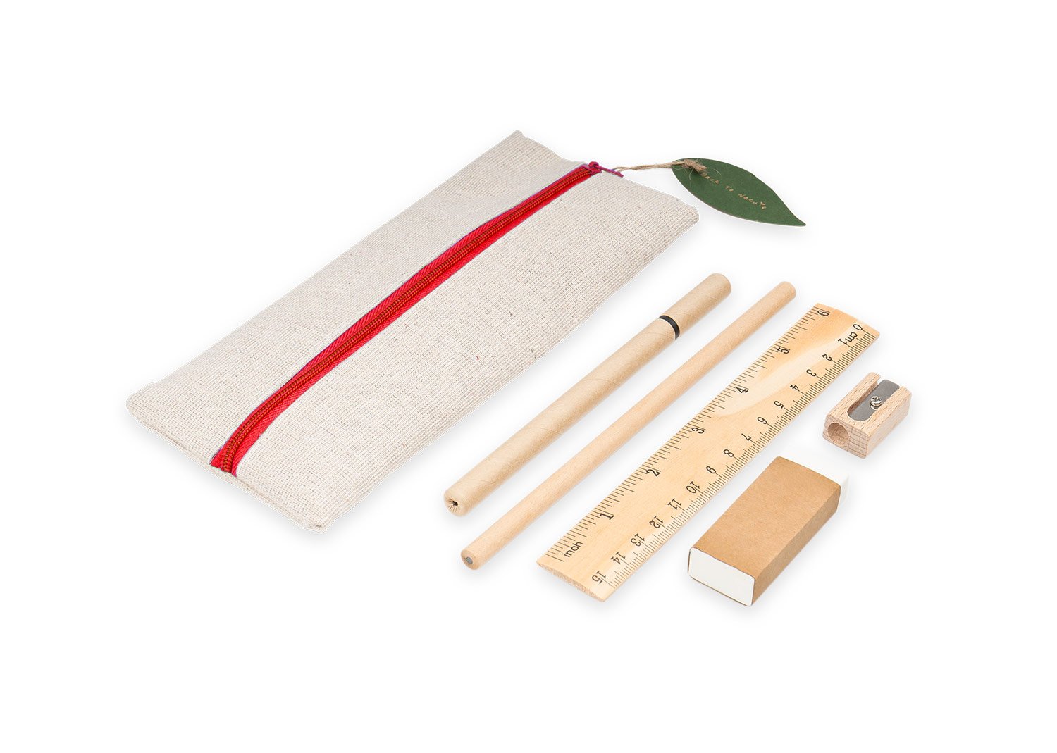 Cartuchera escolar de diseño fresco y natural que incluye: lápiz, bolígrafo, borrador, sacapuntas y regla de 15 cm.