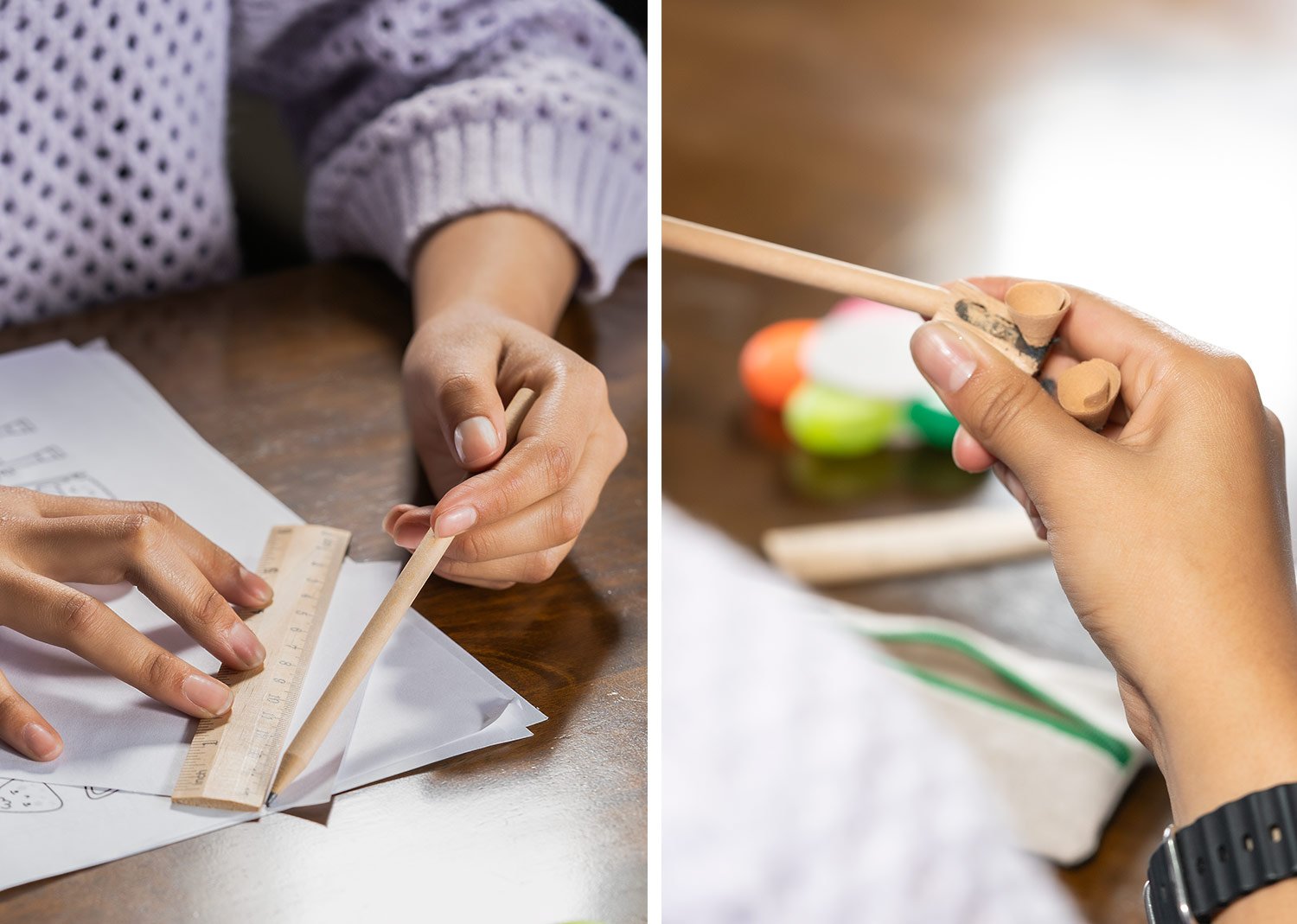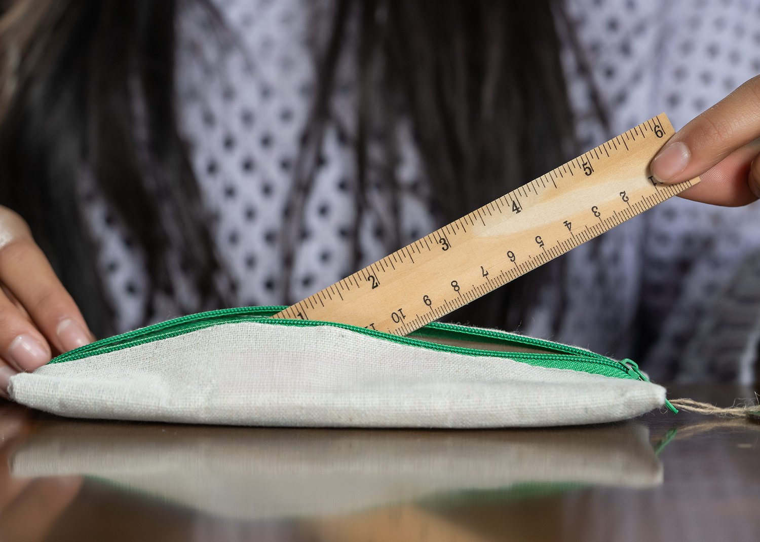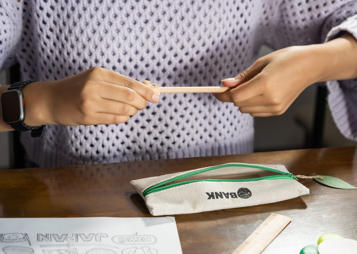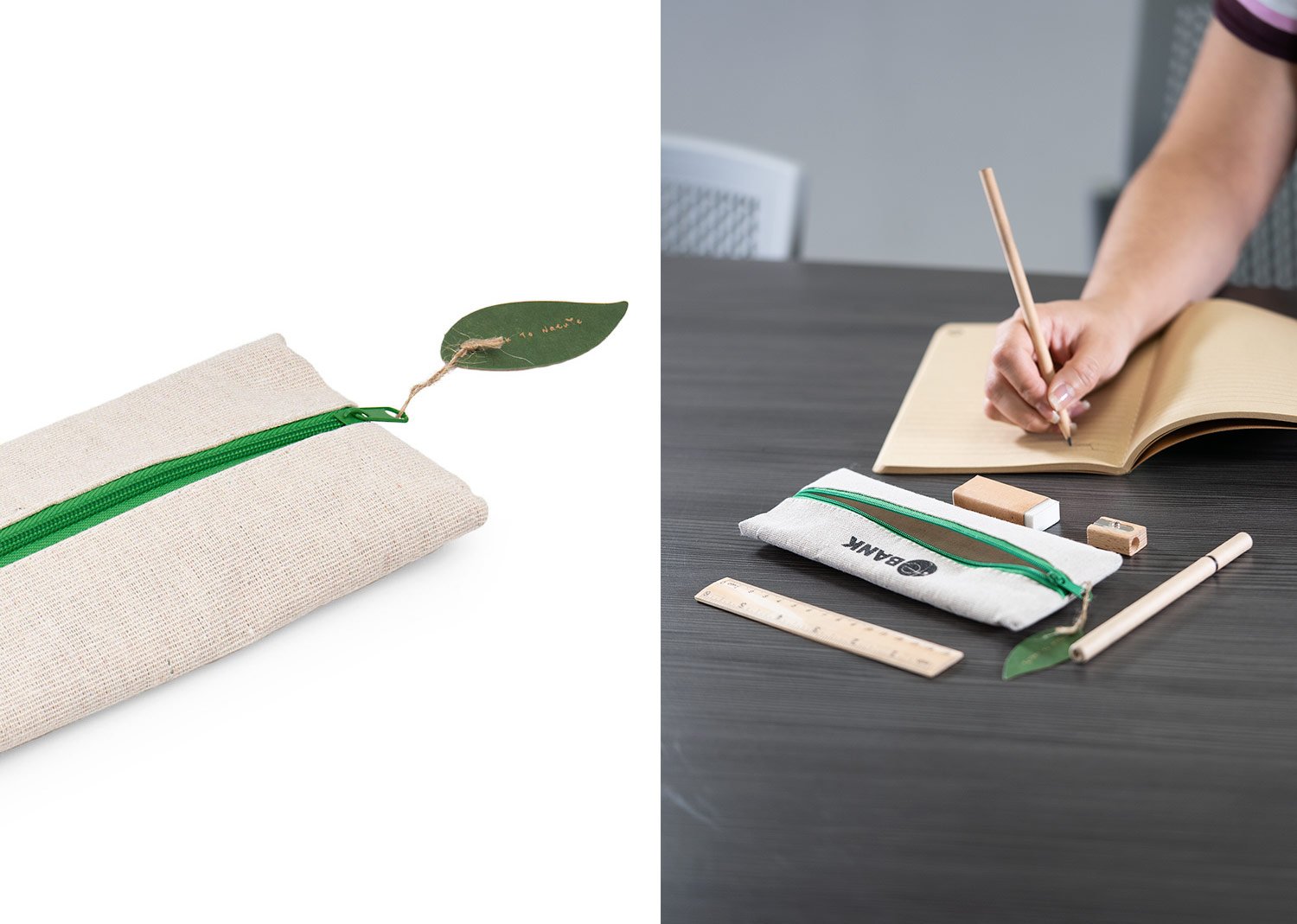 Cartuchera escolar de diseño fresco y natural que incluye: lápiz, bolígrafo, borrador, sacapuntas y regla de 15 cm.