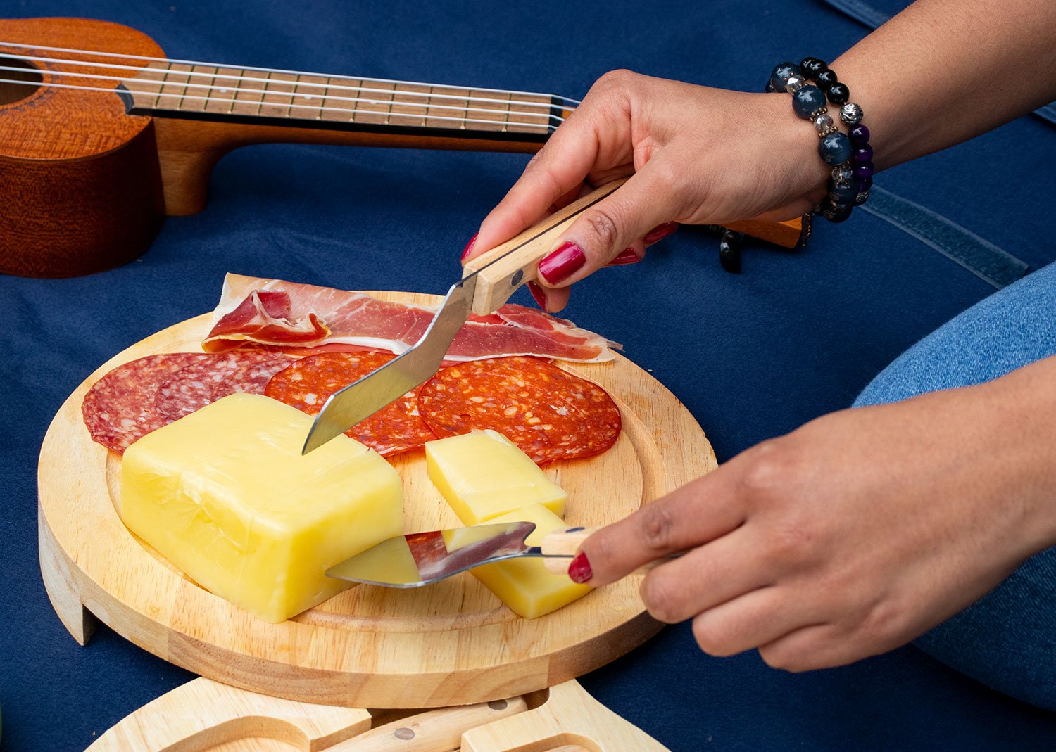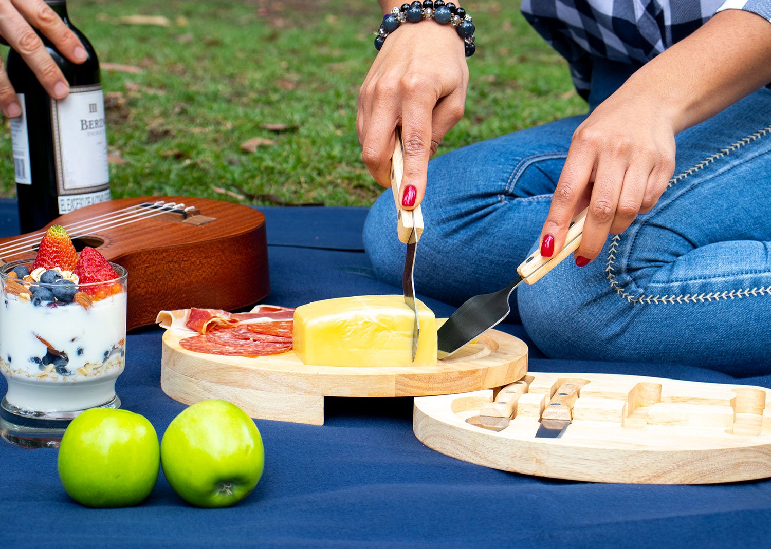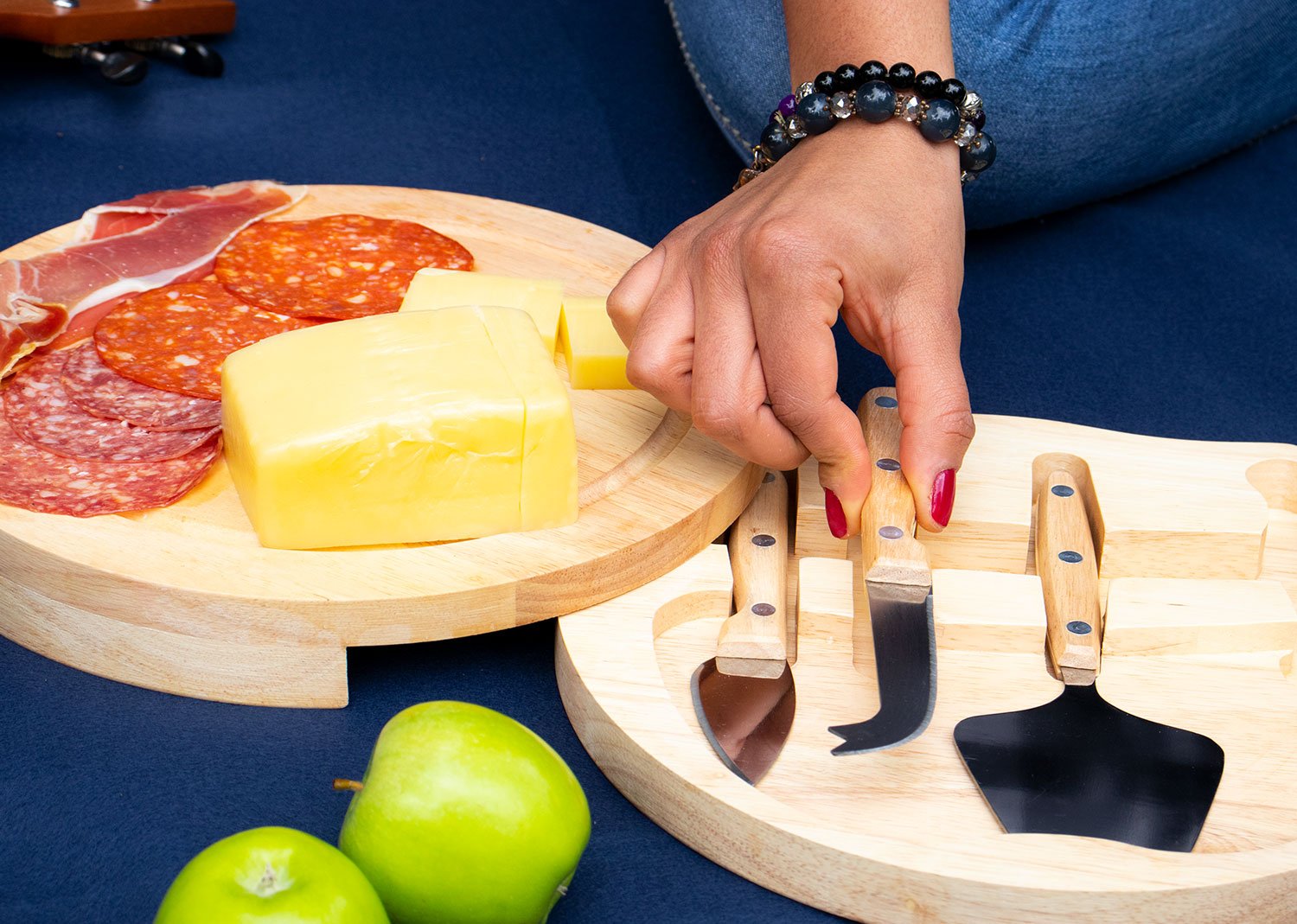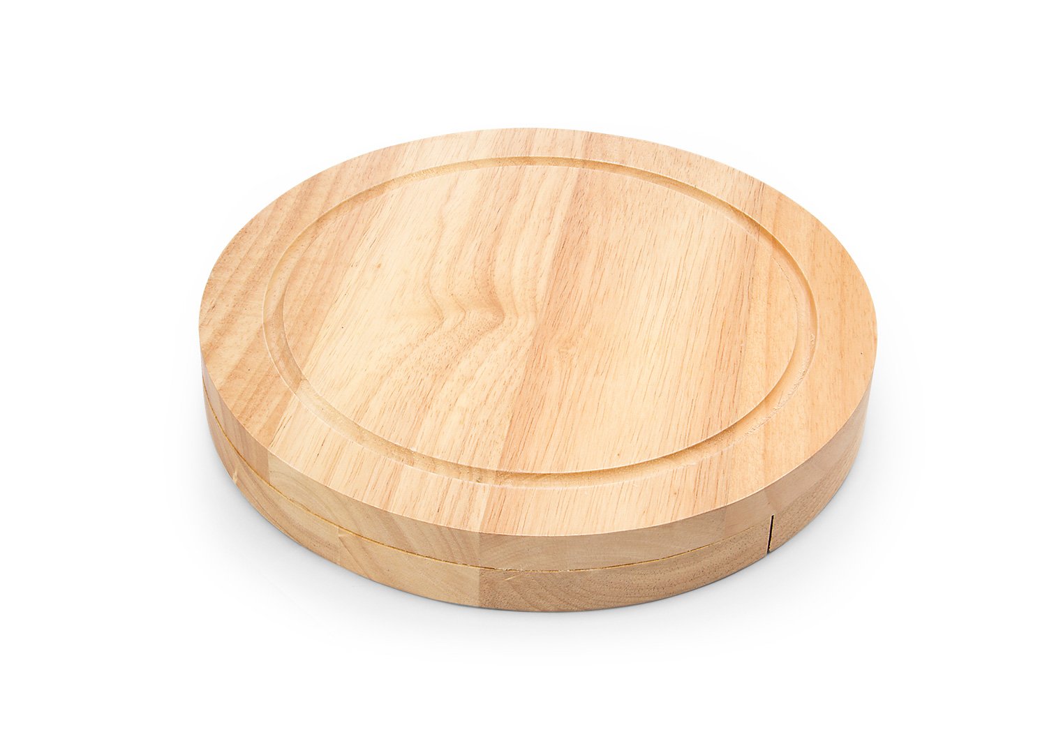 Tabla redonda con 4 Cuchillos para quesos. Lavar con agua y jabón y secar al aire libre.