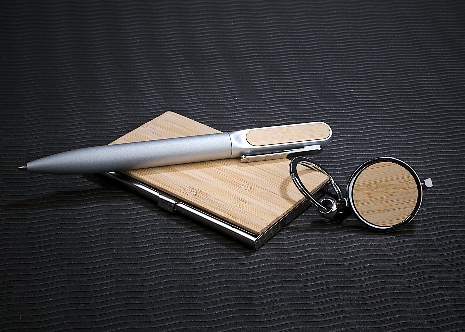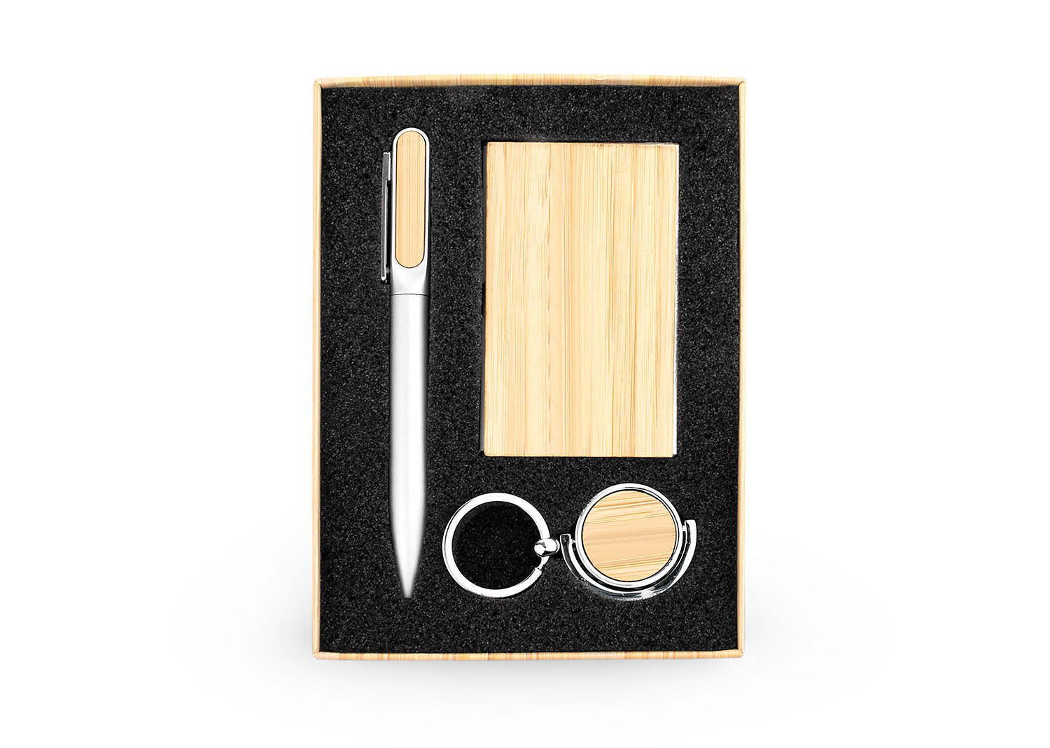 BambúSet ejecutivo, incluye porta tarjetas metálico, llavero circular metálico y bolígrafo en Aluminio con sistema twist, todos con acabados en bambú para la marca en láser. Empaque en caja individual con papel forrado imitación bambú.