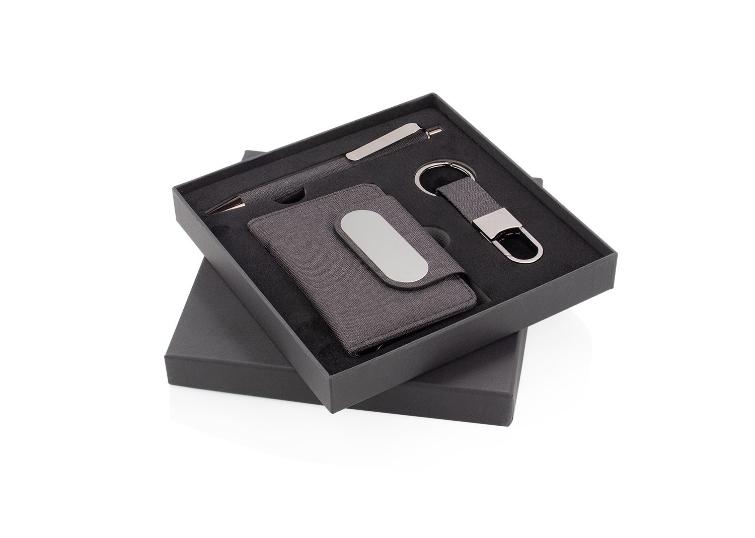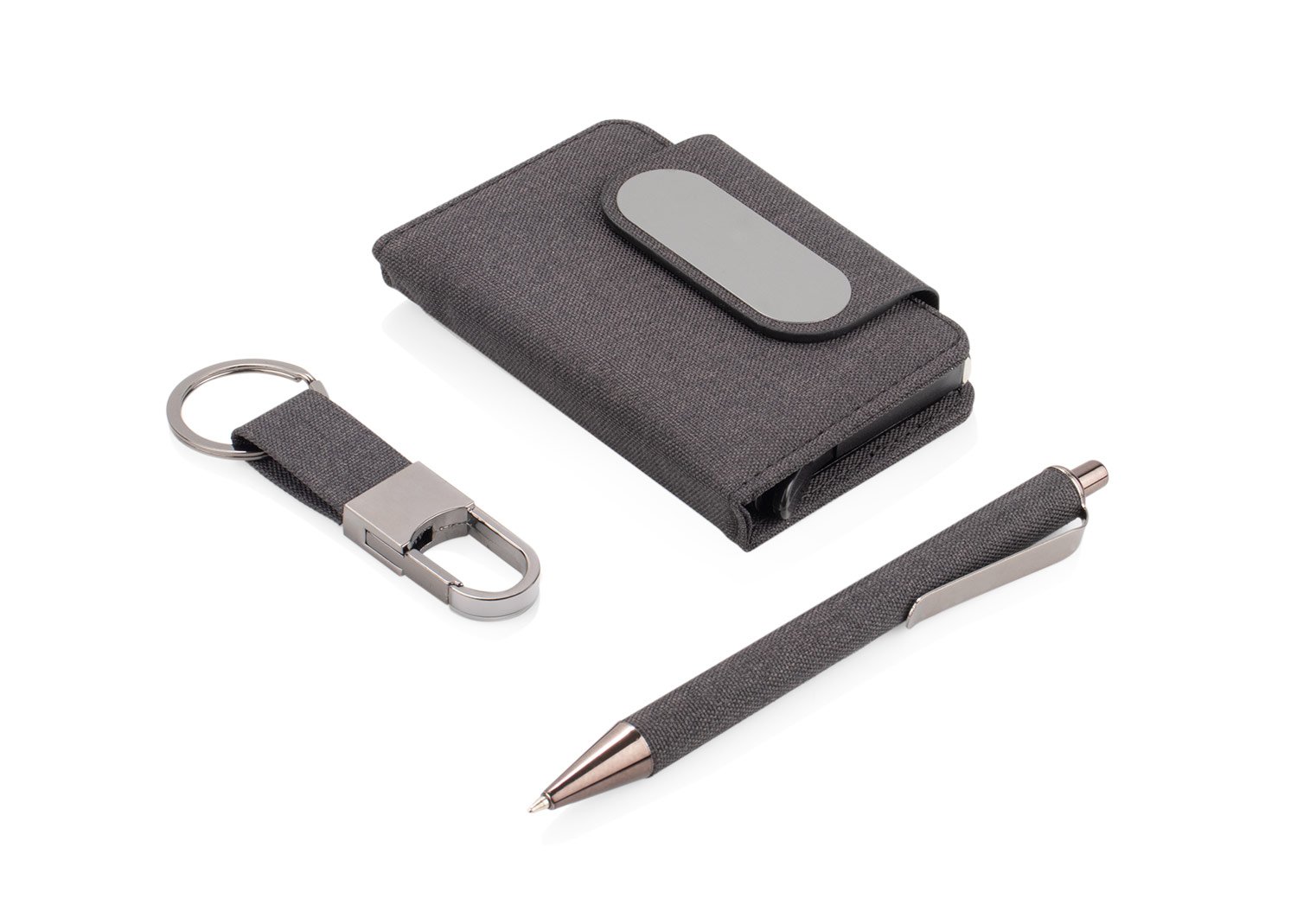 Accesorios de EscritorioSet de oficina elegante y sostenible. Incluye tarjetero metálico forrado en tela RPET (7,3 X 10,5 X 1,7), bolígrafo de aluminio con detalle textil (14 X Ø 0,9 X 1,3) y llavero a juego (2 X 8,1 X 1), todo presentado en una caja de diseño sofisticado. Ideal para regalo corporativo. La billetera cuenta con un mecanismo RFID especial que bloquea la lectura no autorizada de tarjetas, protegiendo su información personal.