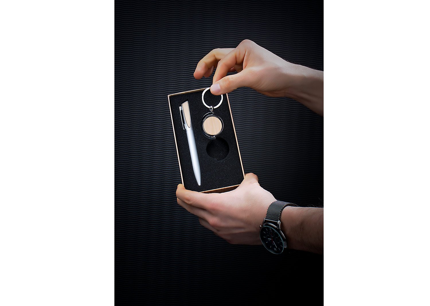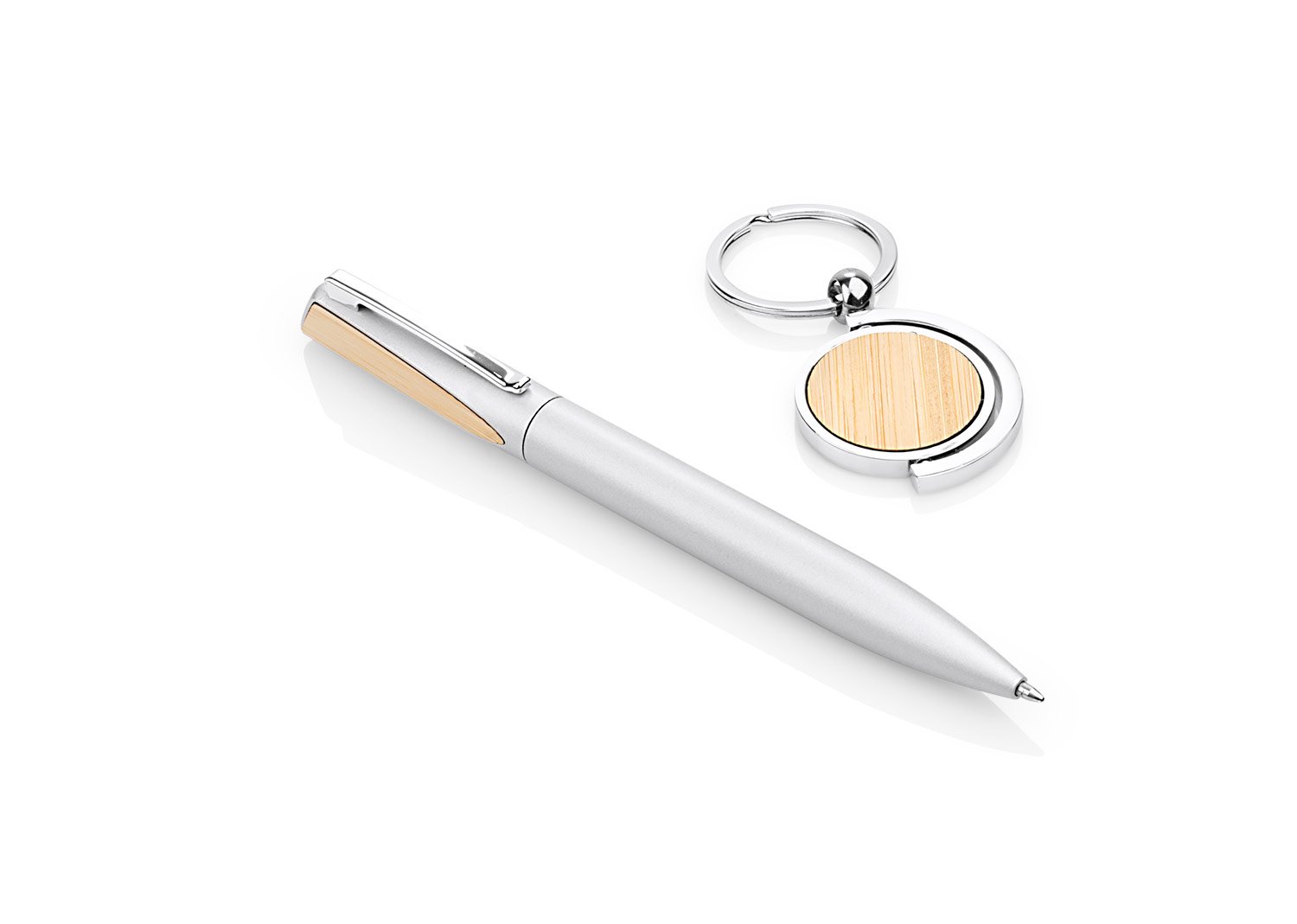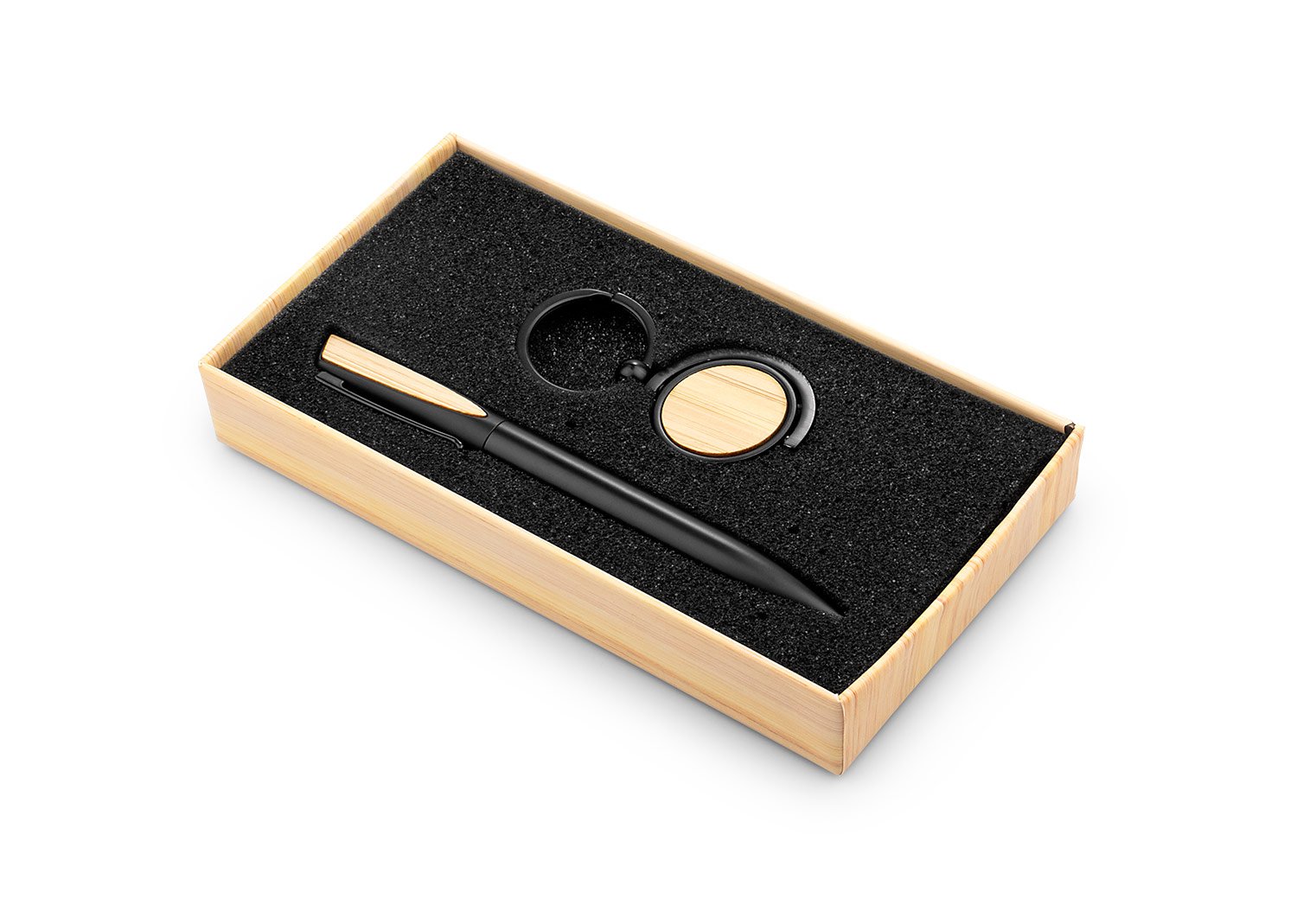 Set ejecutivo, incluye llavero circular metálico y bolígrafo en Aluminio con sistema twist y clip metálico acabado en Bambú, ambos con acabados en bambú para la marca en láser. Empaque caja individual con papel forrado imitación bambú.