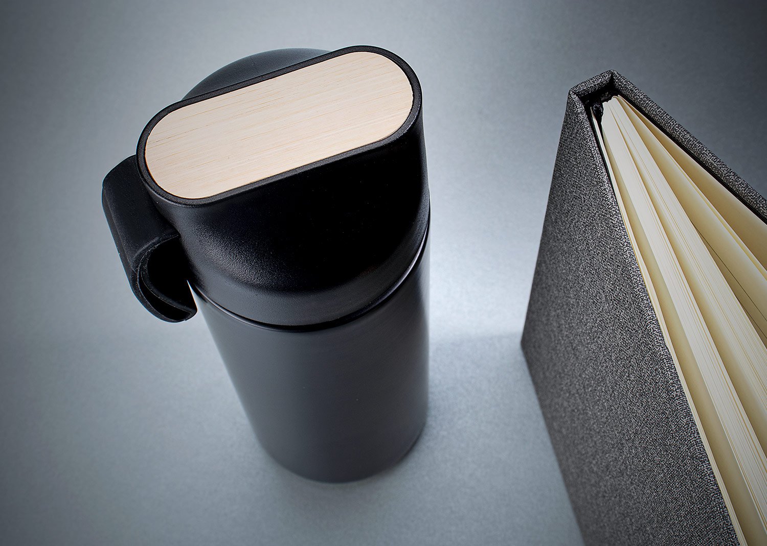 BambúSet ejecutivo con estuche de lujo. Incluye bolígrafo en aluminio con sistema twist, Libreta con 80 hojas rayadas, banda elastica de cierre lateral, cinta marcadora y portabolígrafo. Mug de 600 ml con tapa de Bambú / 20 Oz en acero inoxidable con tapa rosca y banda de silicona para transportar con facilidad. los 3 elementos tienen un detalle en Bambú para marcar en láser.