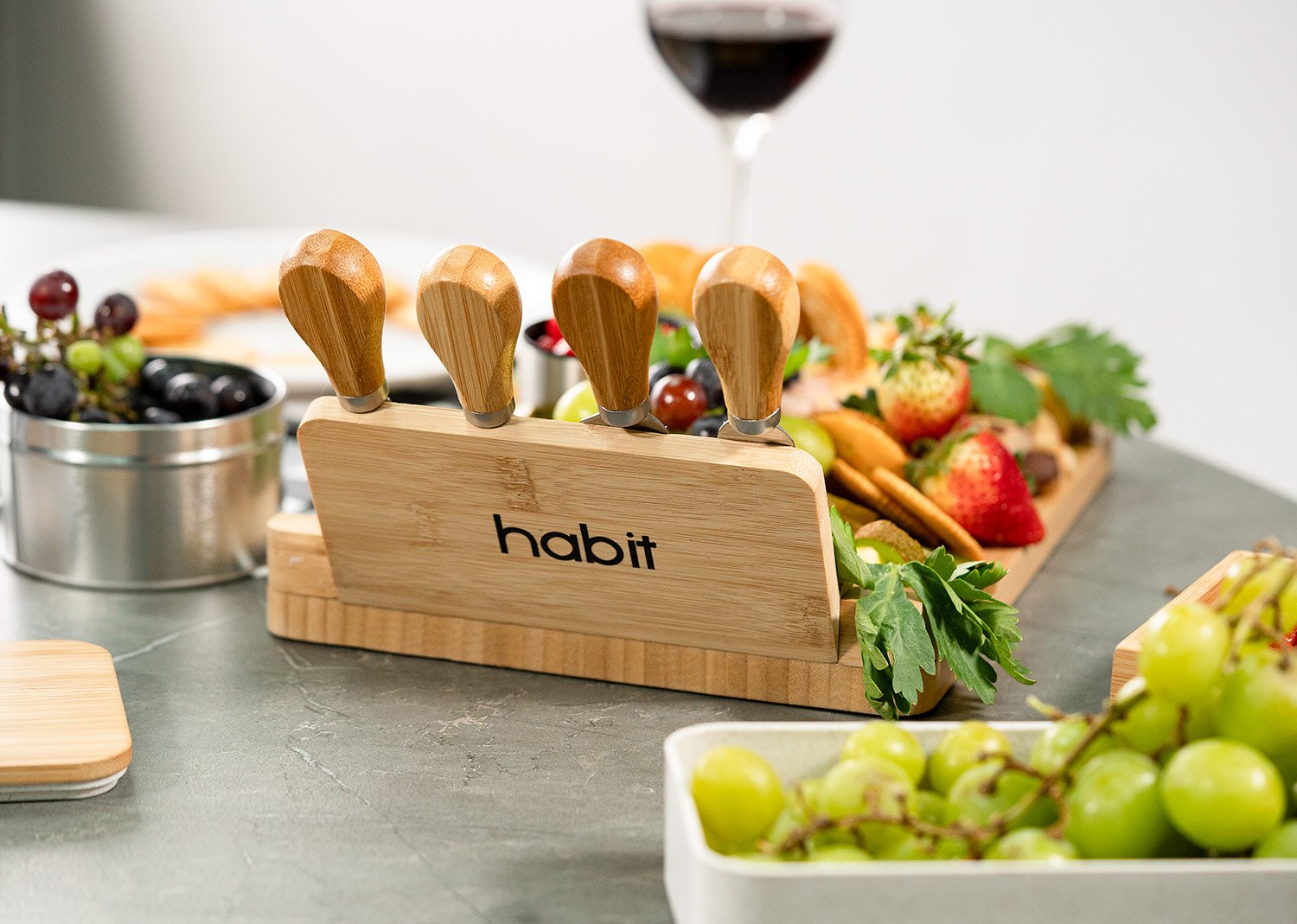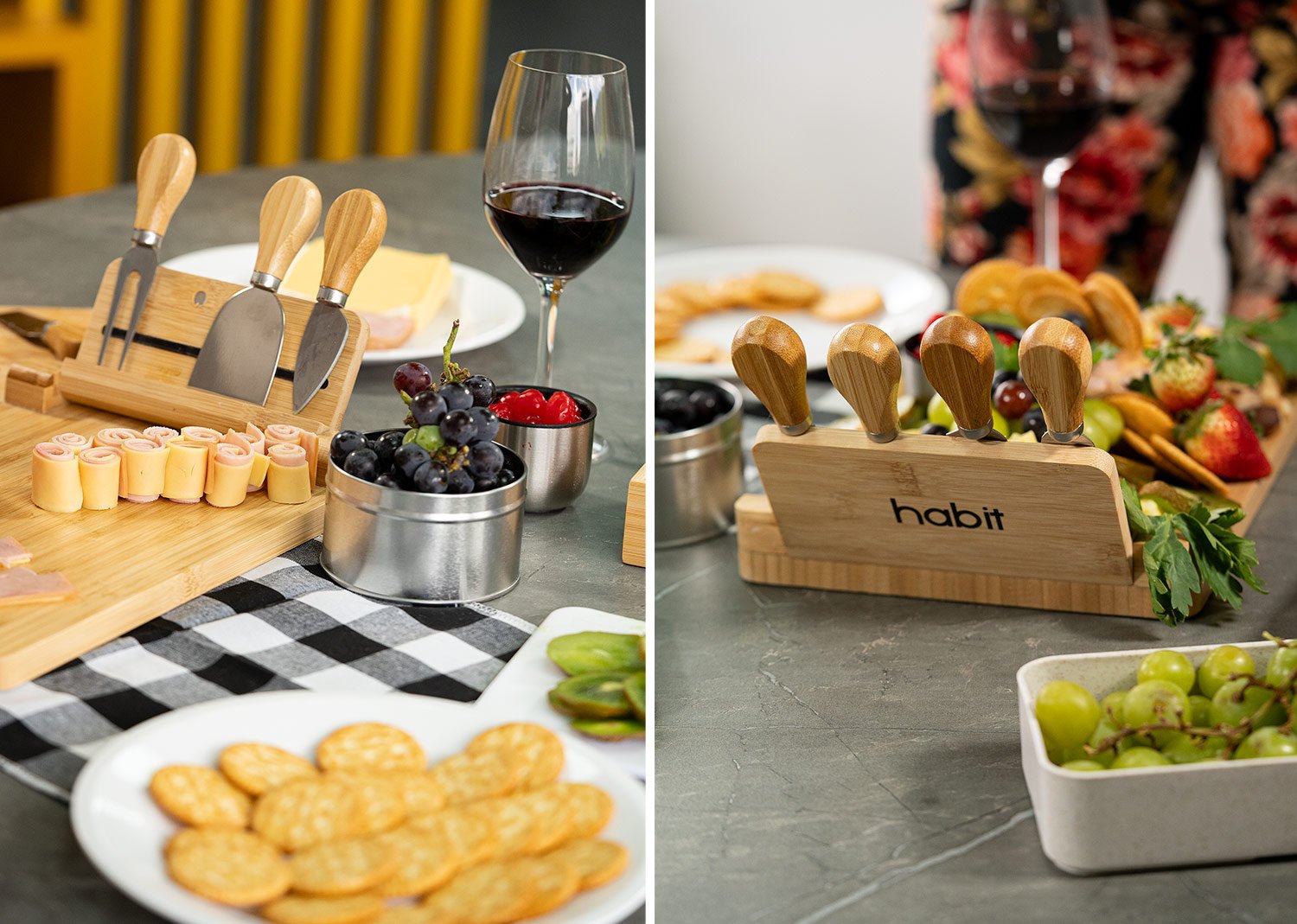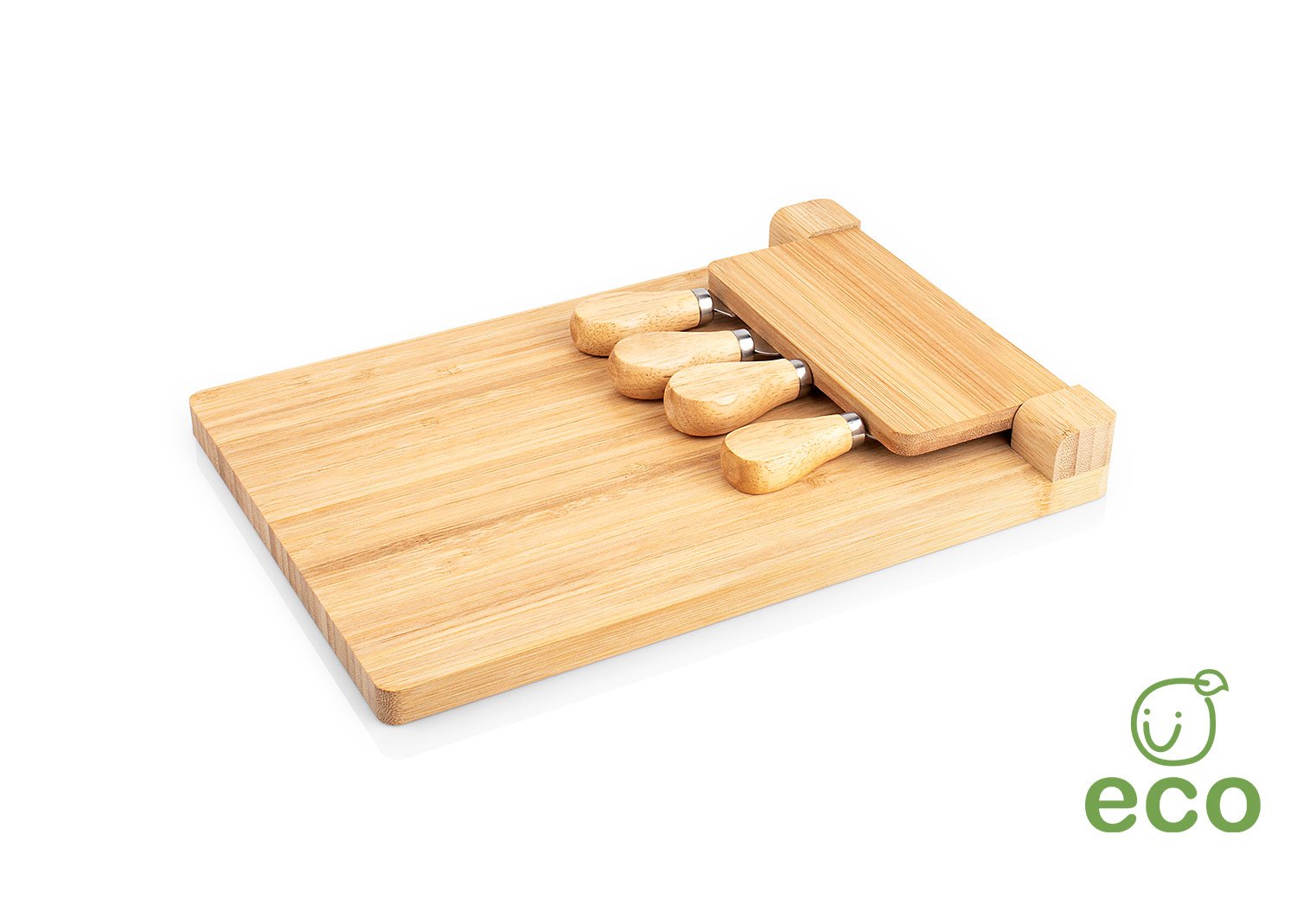 BambúTabla de quesos rectangular imantado con 4 Utensilios: Cuchillo para parmesano, Tenedor, quesos blandos y quesos duros. Lavar con agua y jabón y secar al aire libre.