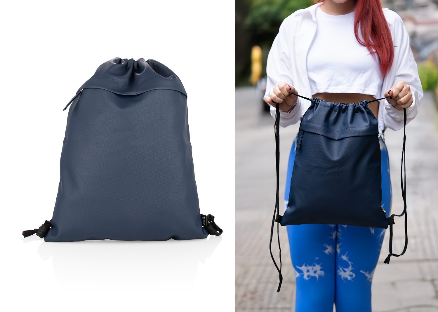 Tula deportiva ecológica, cuenta con un bolsillo frontal con cremallera. Fabricada en RPET.